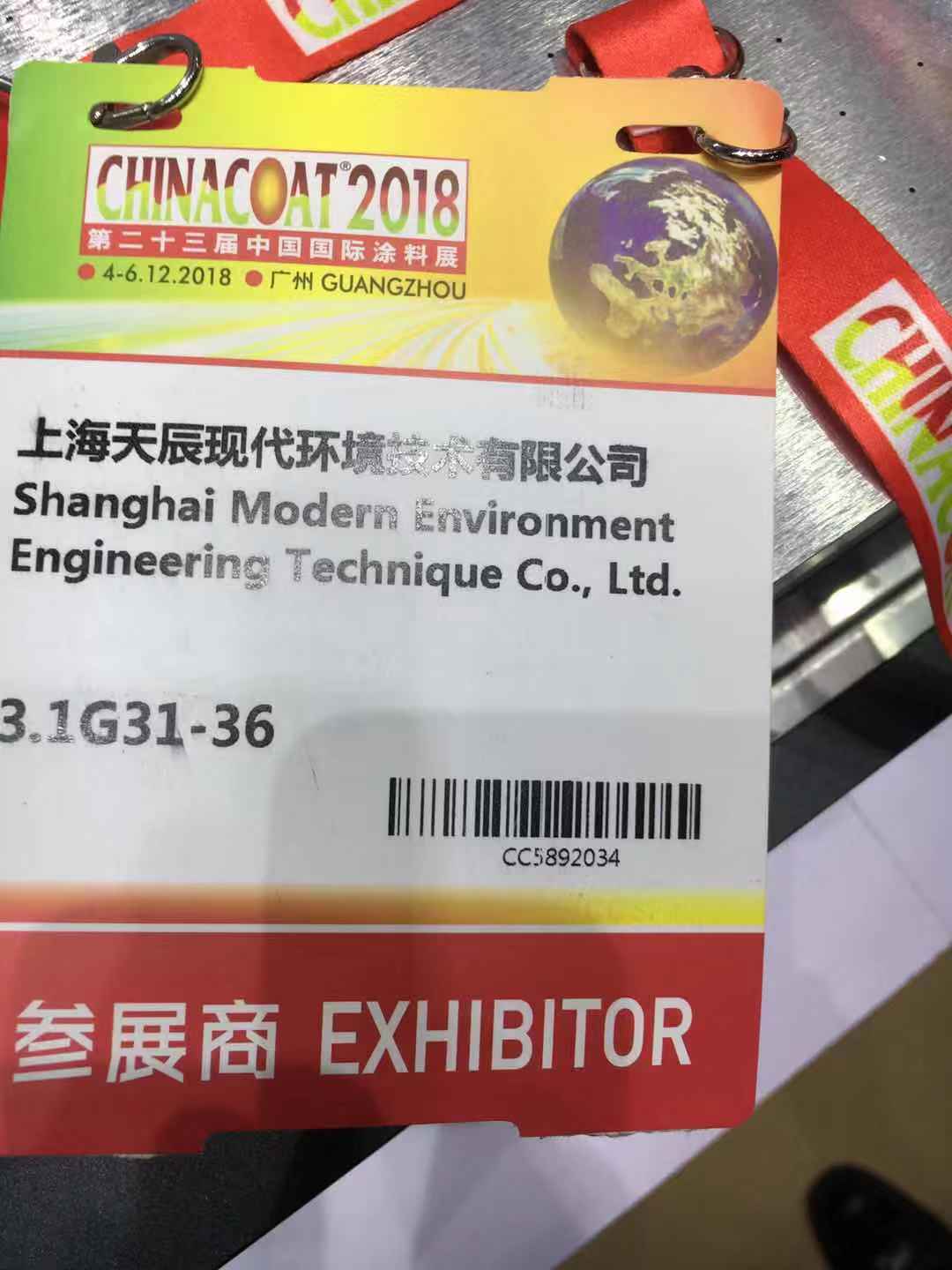 第二十三届中国国际涂料展CHINACOAT于2018年12月4日-6日在中国进出口商品交易会展馆(广州)隆重举行。本次展览我司与上海现代环境工程技术股份有限公司设有展位:E3.1G21-36。展位设有多款产品展示,欢迎您的光临与洽谈!